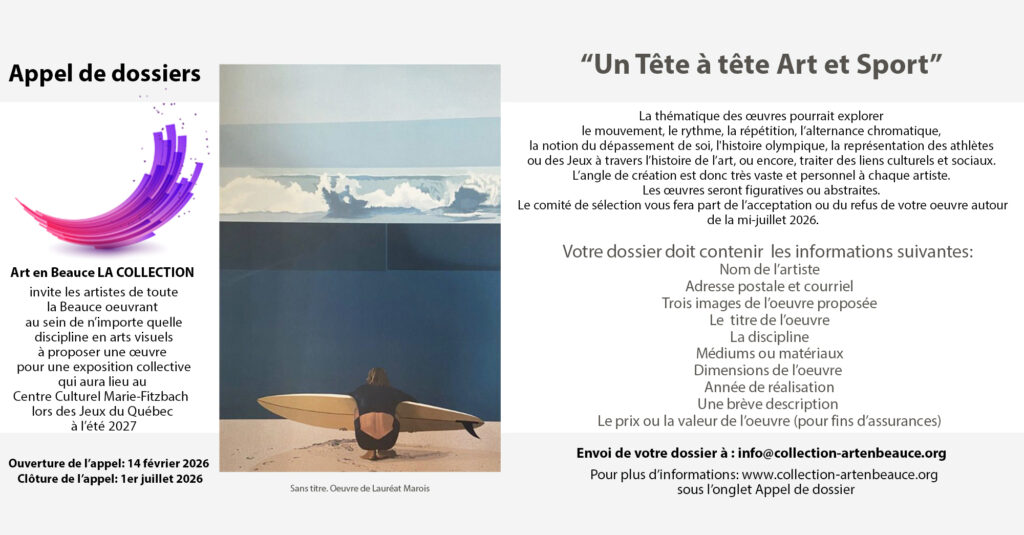 Art en Beauce LA COLLECTION lance un appel de dossier dès le 14 février prochain! Les artistes de toute la Beauce oeuvrant en arts visuels au sein de n’importe quelle discipline, le dessin, la peinture, la sculpture, la photographie, l’estampe et l’illustration, etc. sont invités à proposer une oeuvre pour une exposition collective qui se tiendra au Centre culturel Marie-Fitzbach de Saint-Georges lors de la tenue des Jeux du Québec durant l’été 2027. Pour plus d’informations, consultez la section Appel de dossiers de notre site internet.
